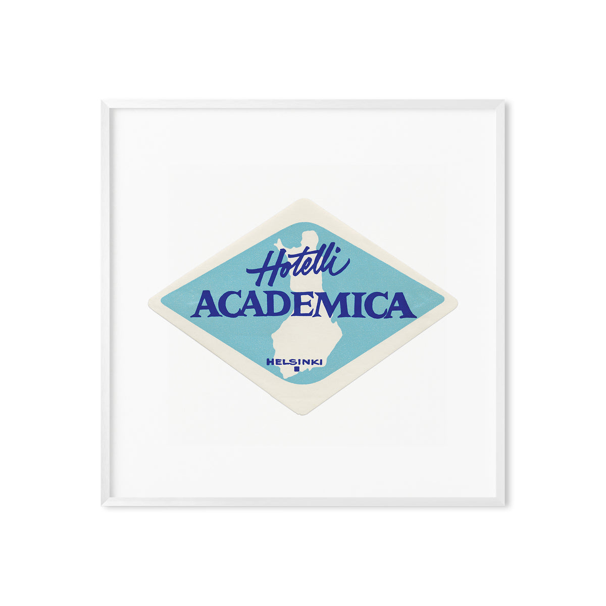 A high-quality art print of a vintage 1960s luggage label from Hotelli Academica, a seasonal student-run hotel that was once located in the Domus Academica complex in Helsinki, Finland.
