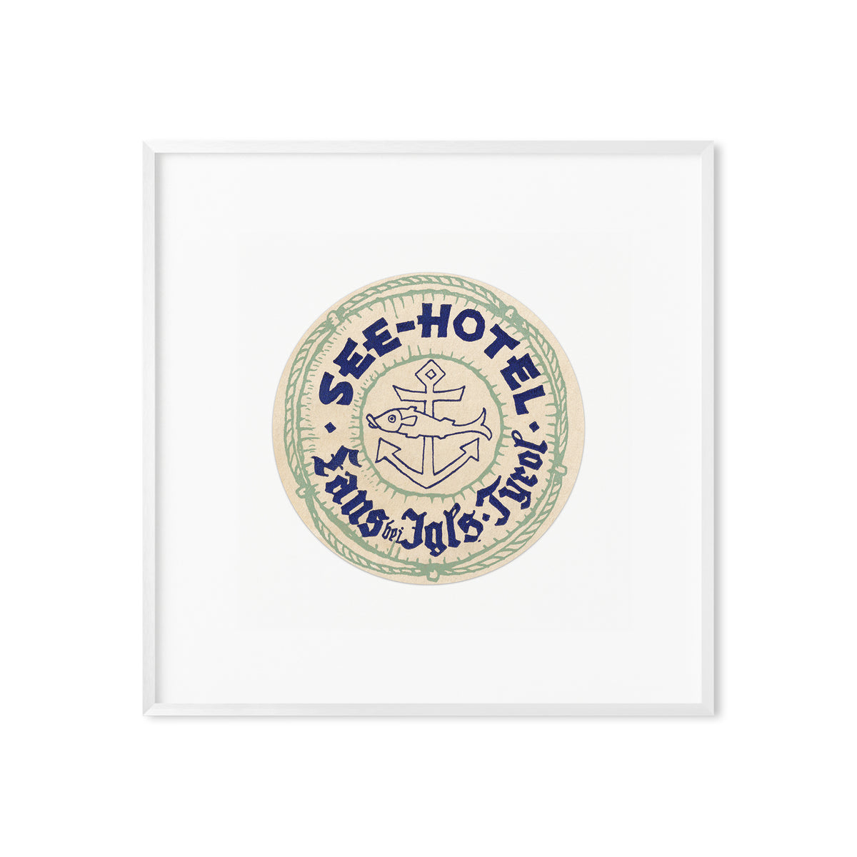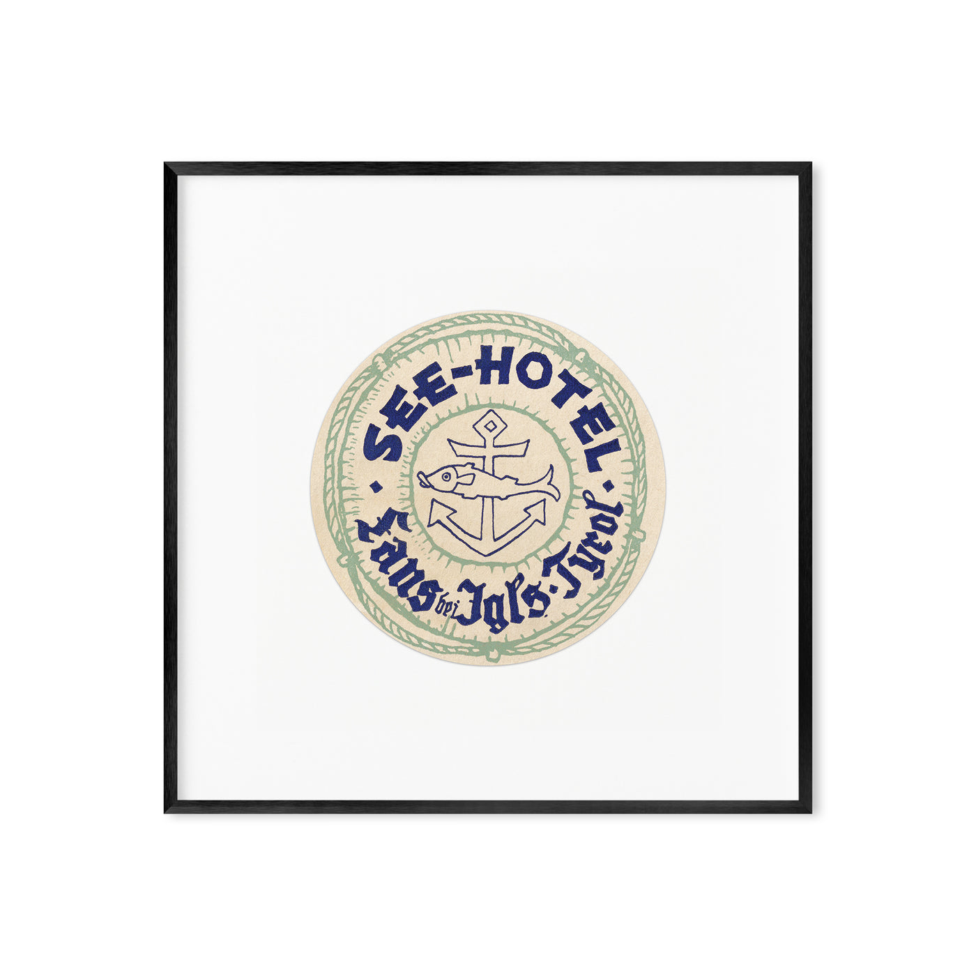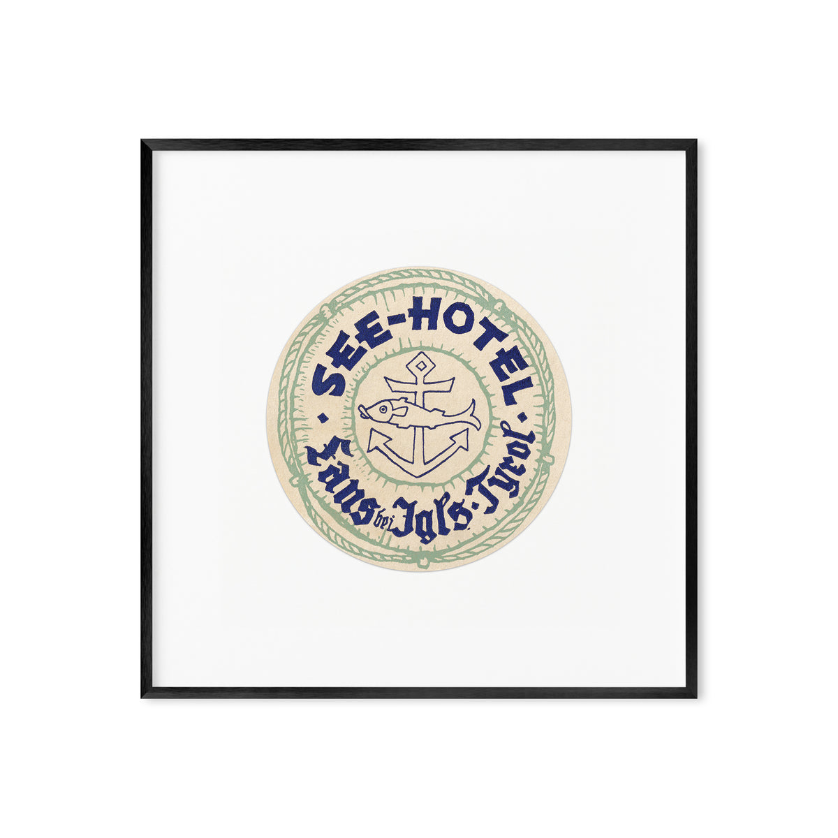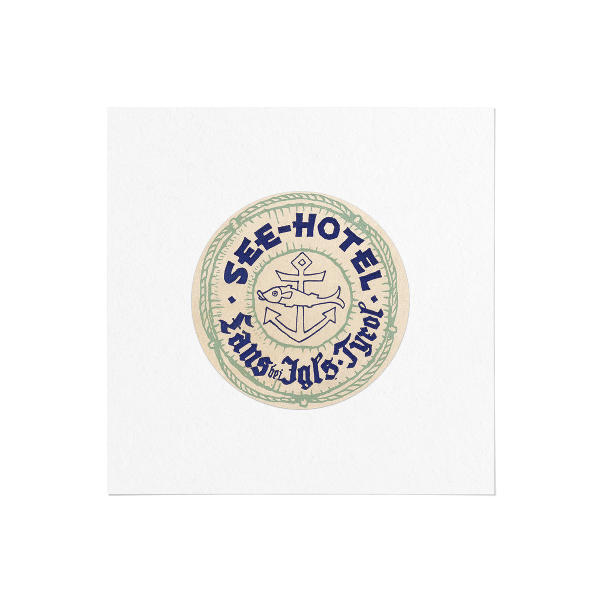 A high-quality art print of a vintage 1930s luggage label from the See-Hotel, an establishment originally in Lans, a small village near Igls in the Austrian state of Tyrol.