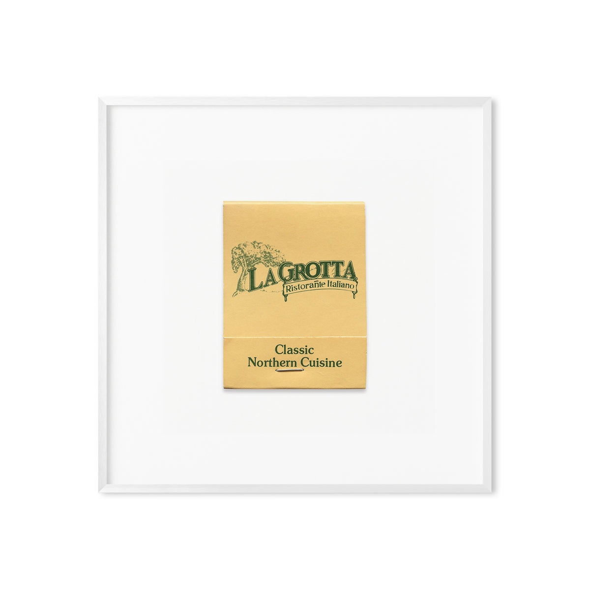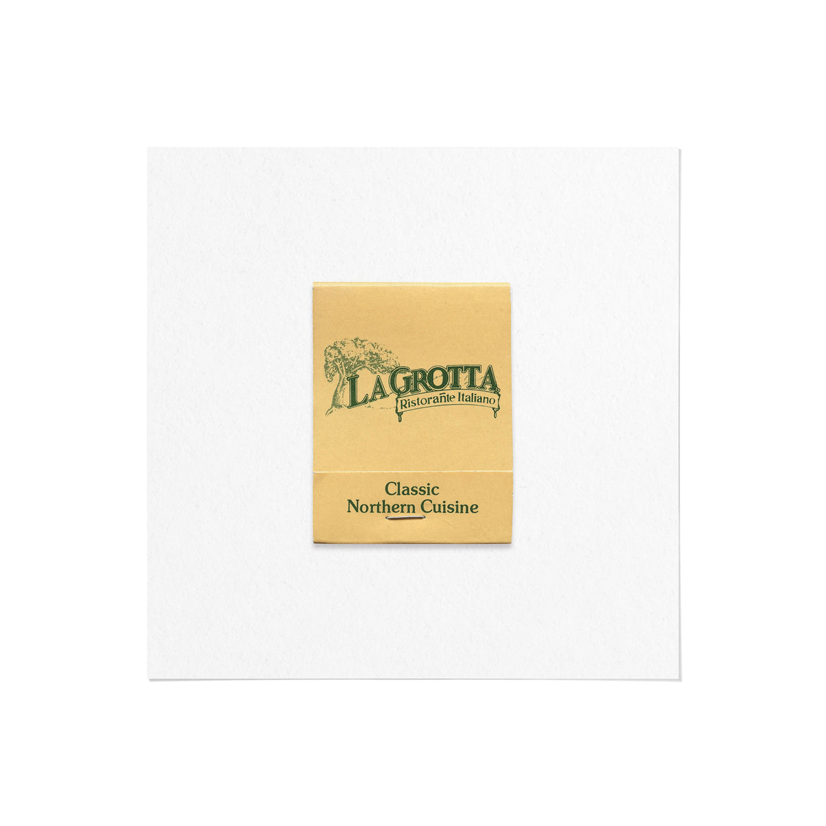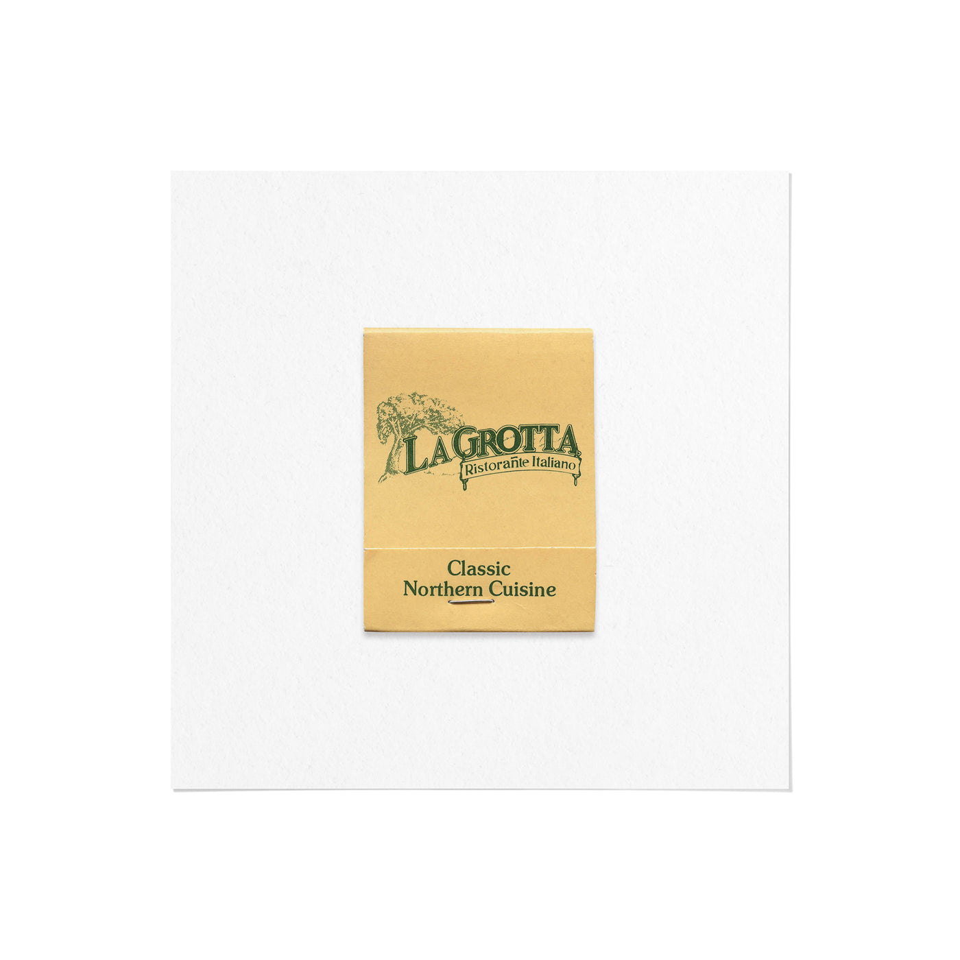 A high-quality art print of a vintage 1980s matchbook from La Grotta Ristorante Italiano, a renowned restaurant celebrated for its Northern Italian cuisine, located in Atlanta, Georgia.