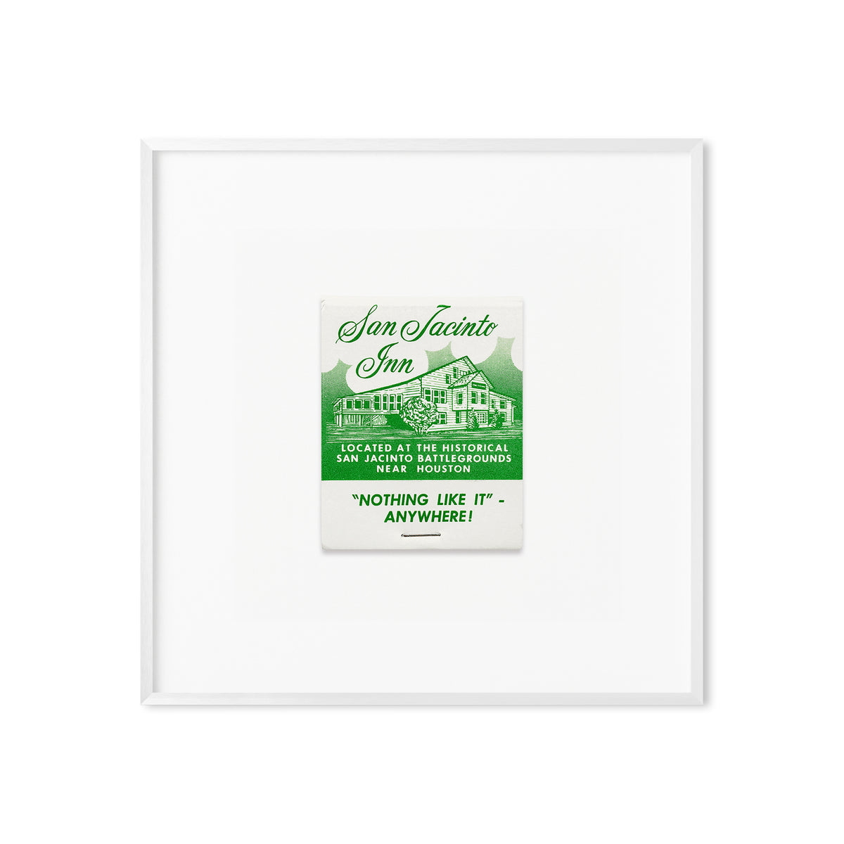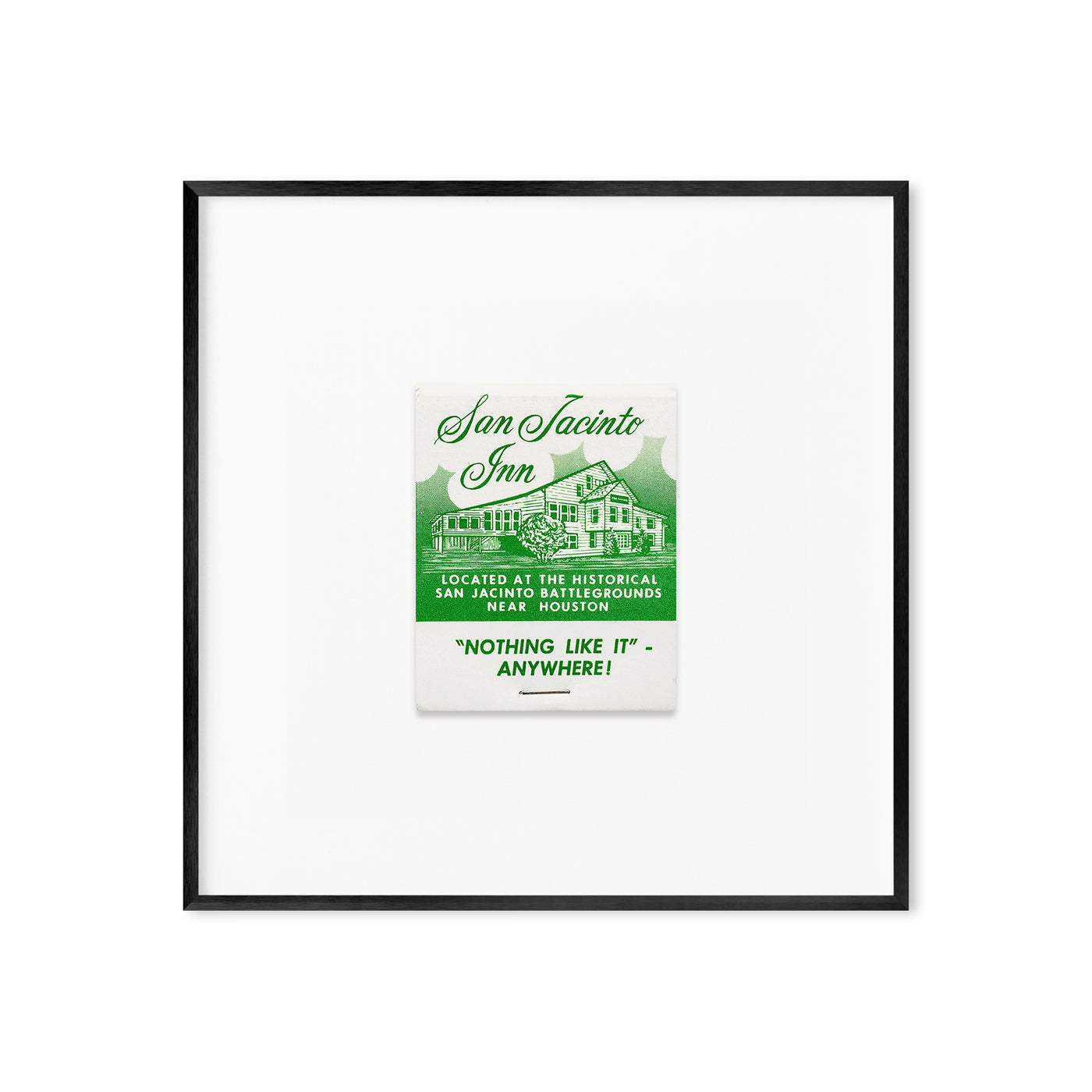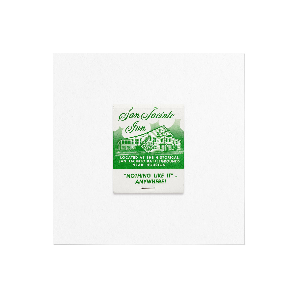A high-quality art print of a vintage 1980s matchbook from the San Jacinto Inn, a legendary Texas dining institution that operated from 1916 to 1987.