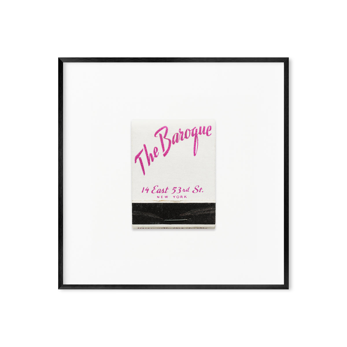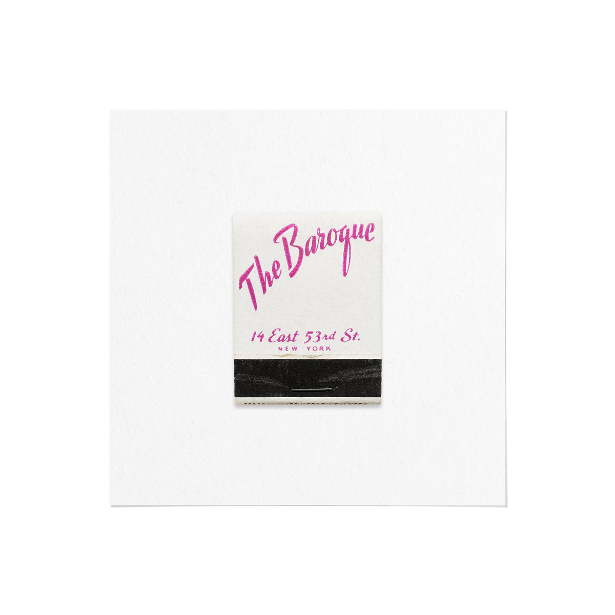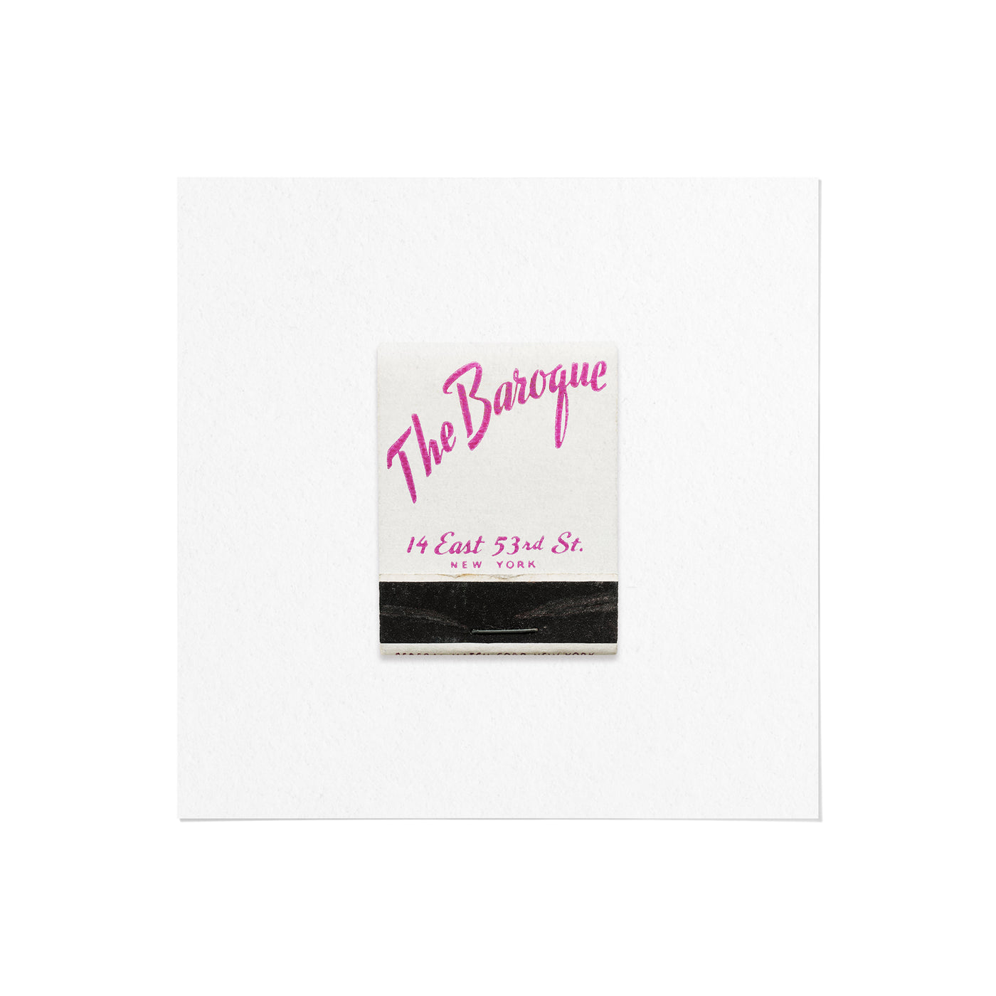 A high-quality art print of a vintage 1940s matchbook from The Baroque, a French restaurant and supper club once located at 14 East 53rd Street in New York City.