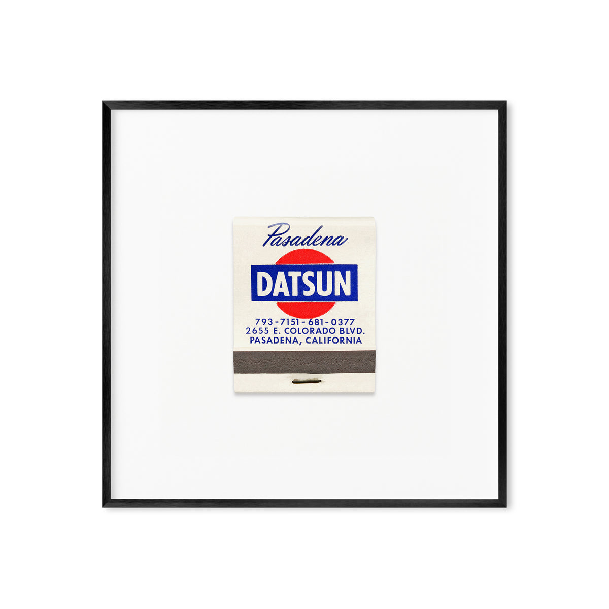 A high-quality art print of a vintage 1960s matchbook from Pasadena Datsun, a former car dealership located at 2655 East Colorado Boulevard in Pasadena, California.