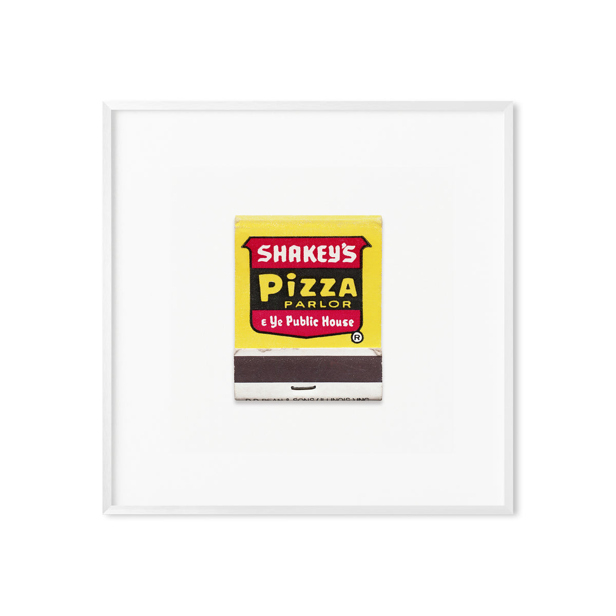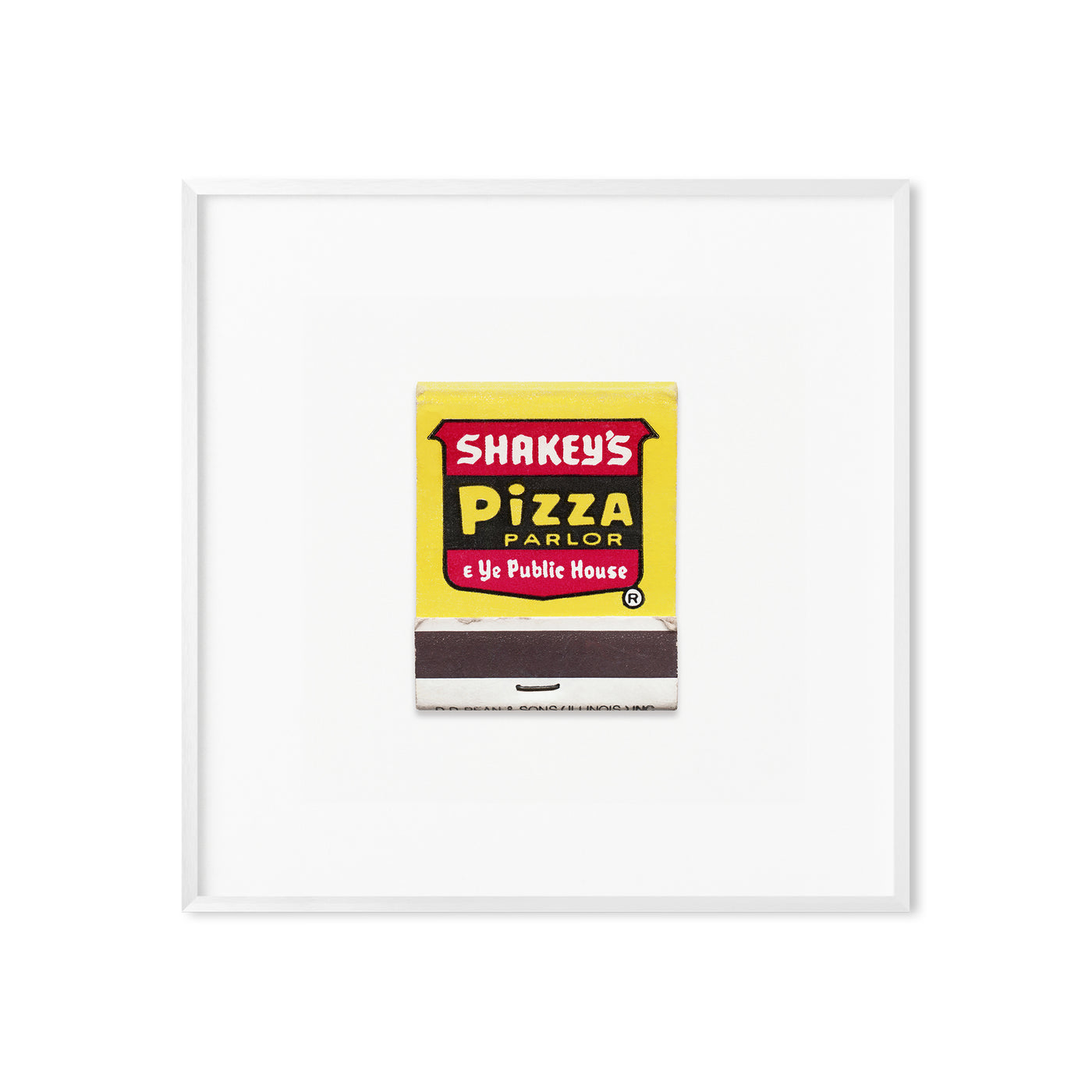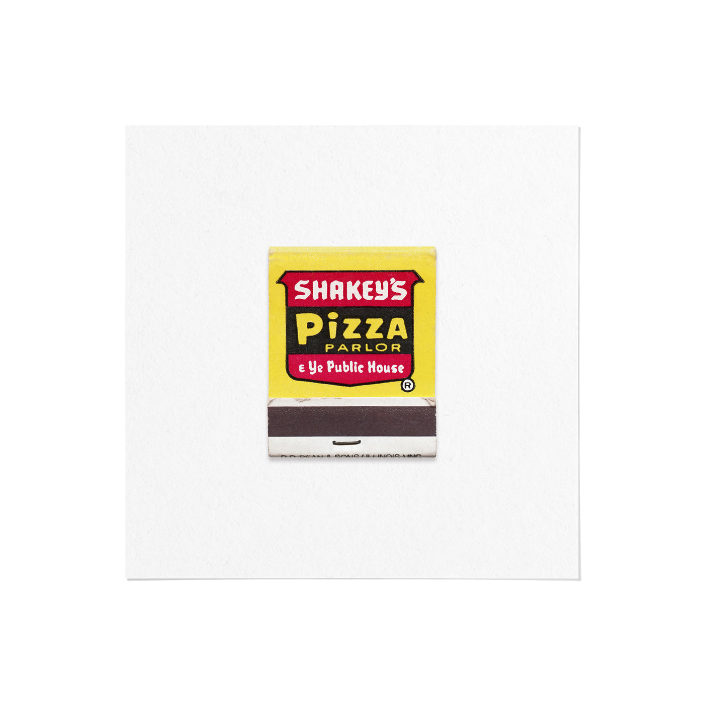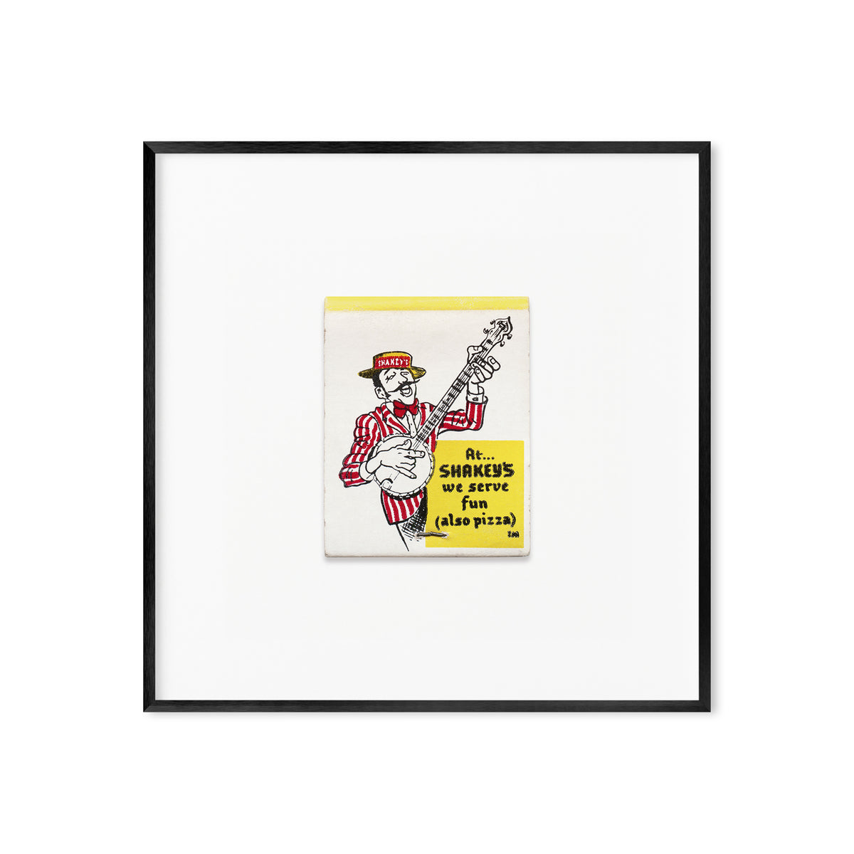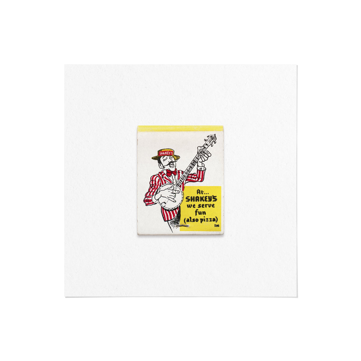 A high-quality art print of a vintage 1960s matchbook from Shakey’s Pizza Parlor, an iconic American restaurant chain known for its old-time saloon aesthetic, live banjo music, and family-style pizza nights.