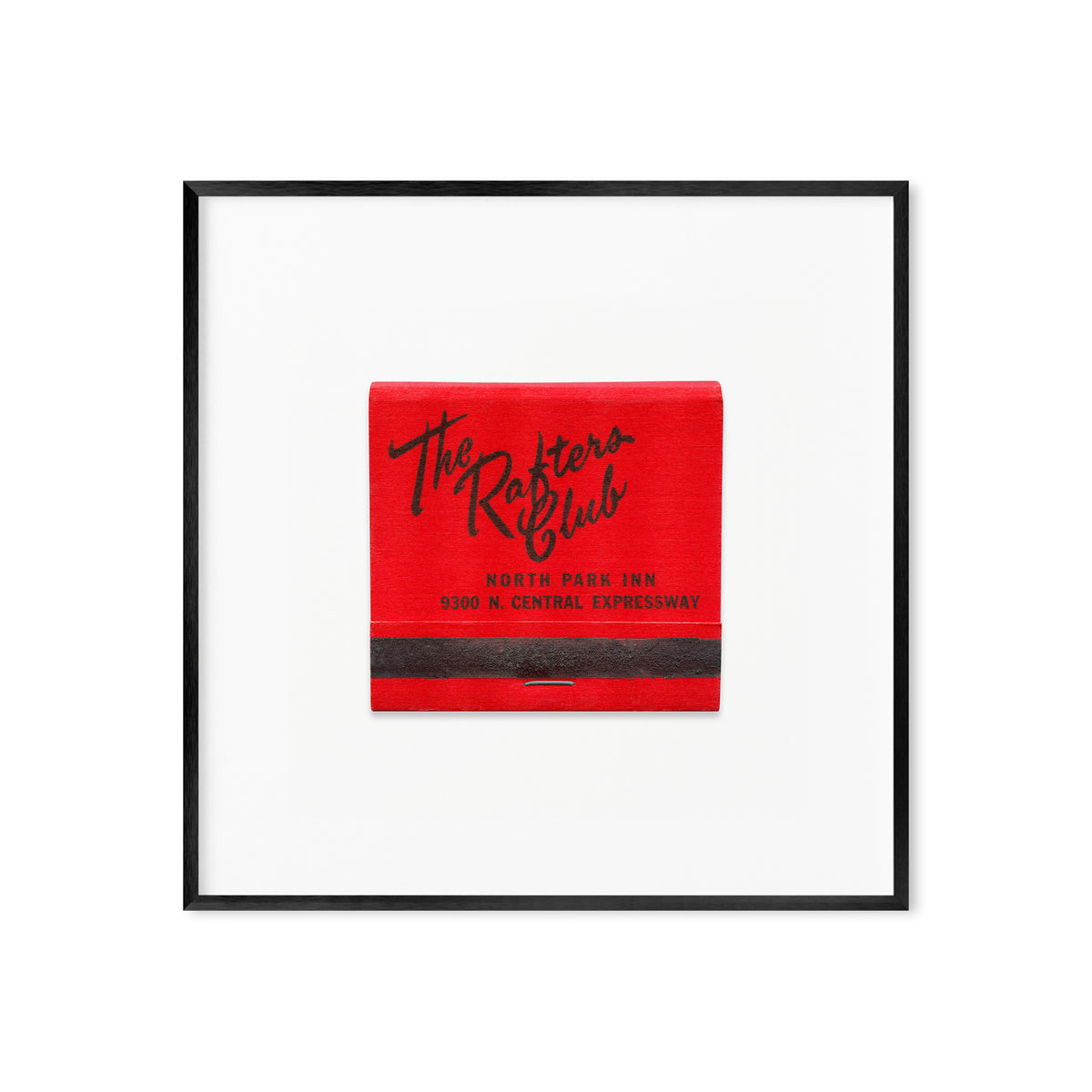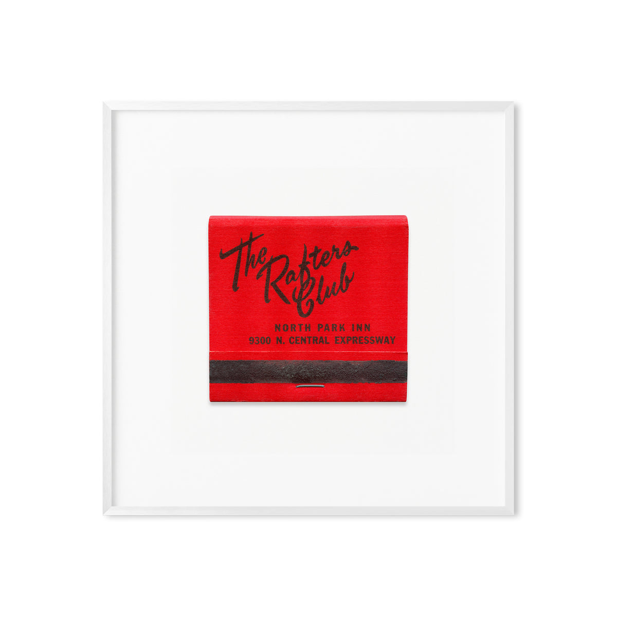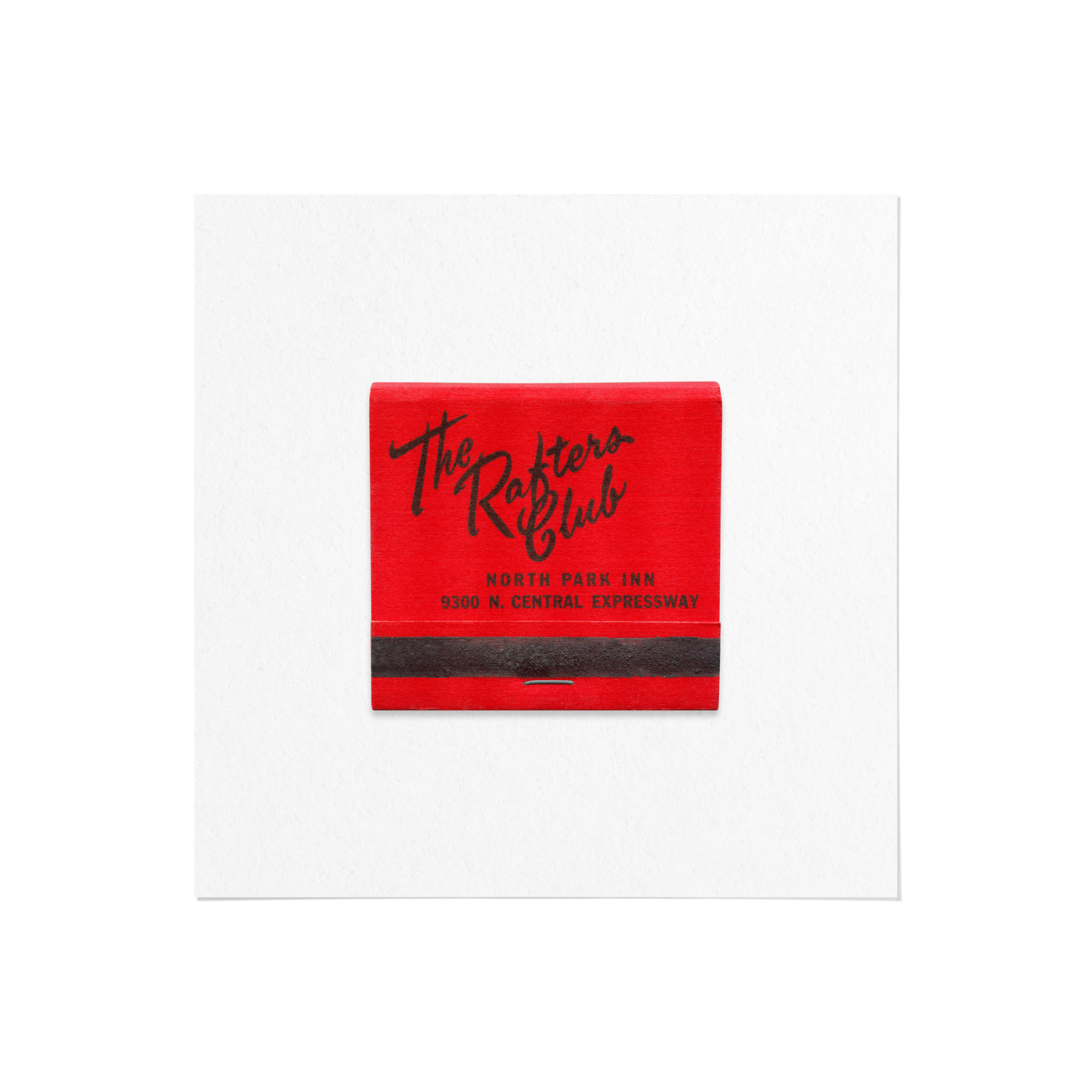 A high-quality art print of a vintage 1960s matchbook from The Rafters Club, an upscale lounge and entertainment venue, once located in Dallas, Texas.