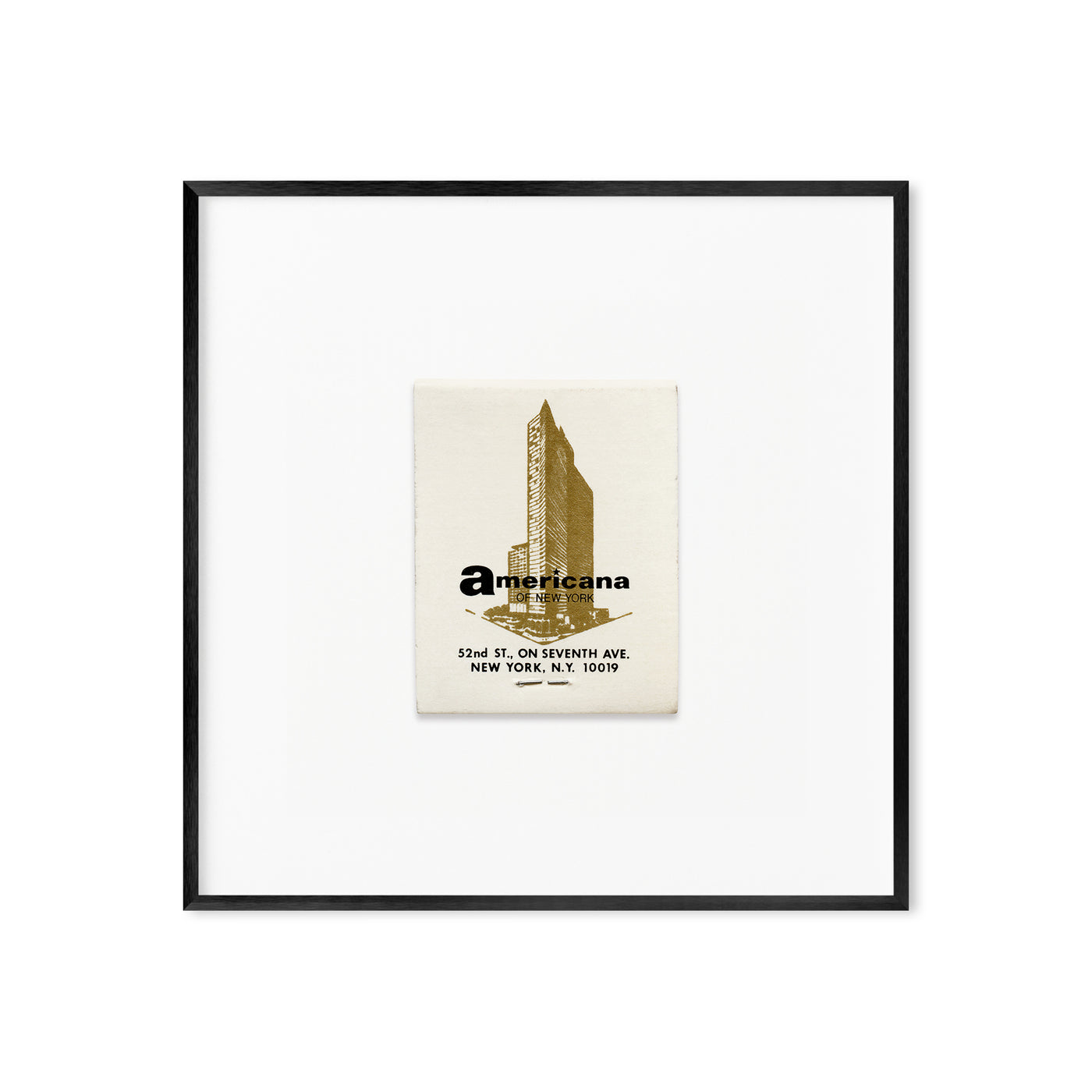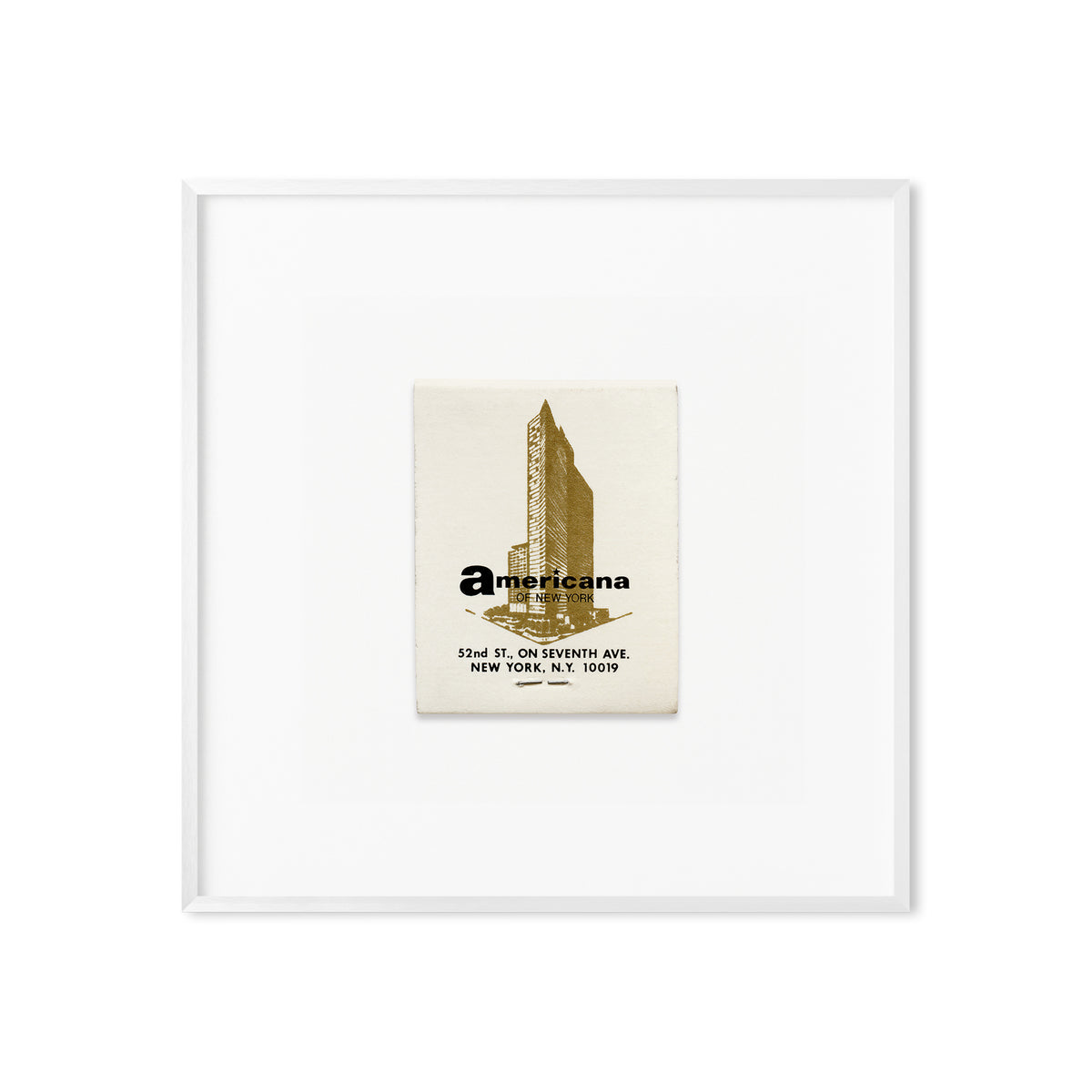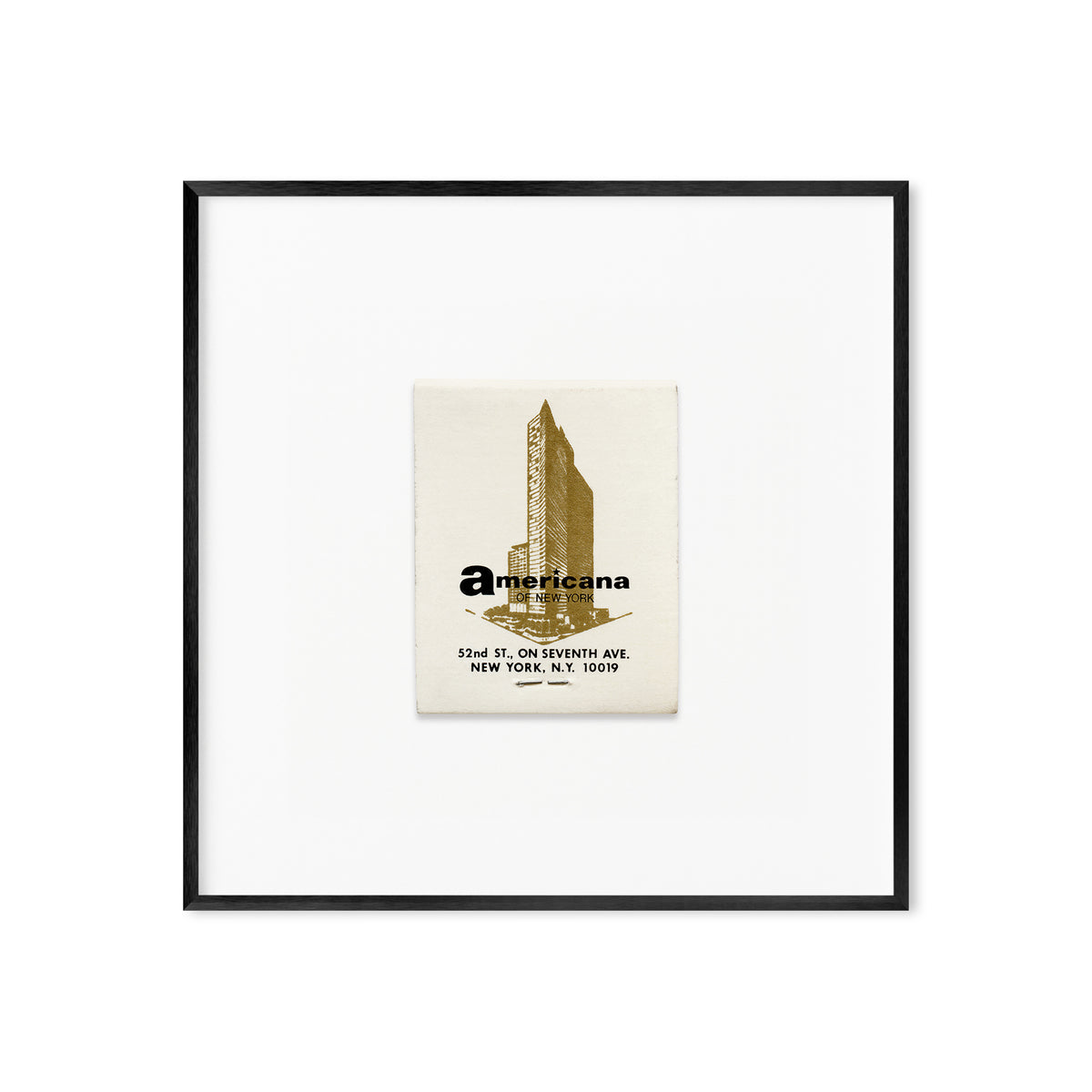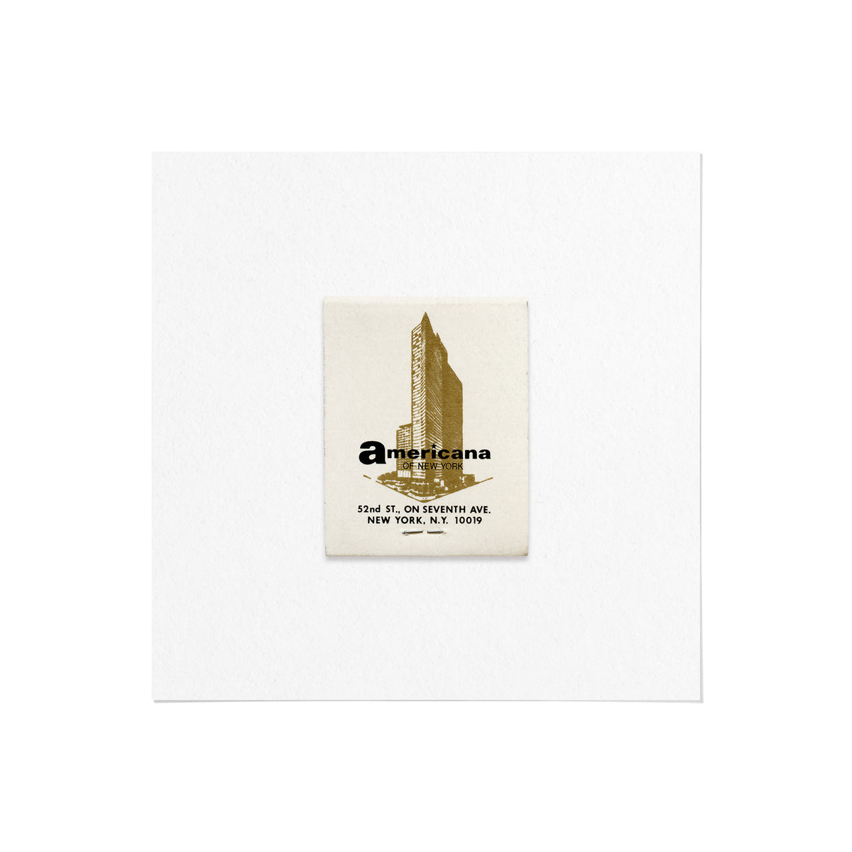 A high-quality art print of a vintage 1960s matchbook from the Americana Hotel, a landmark luxury hotel once located at 1535 Broadway in New York City.