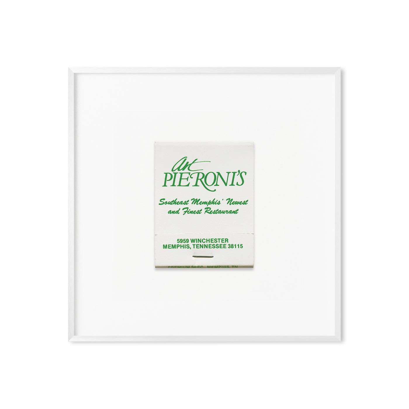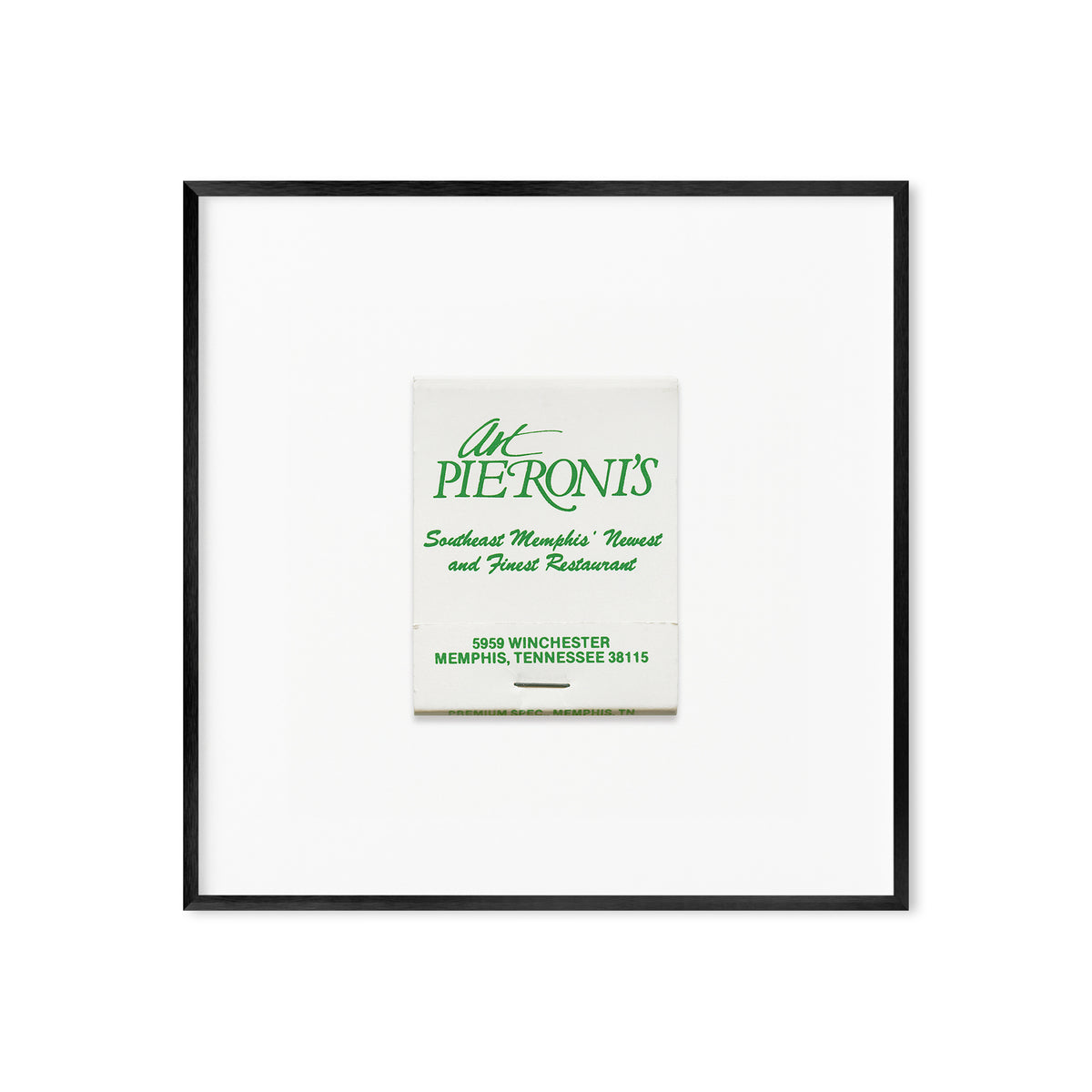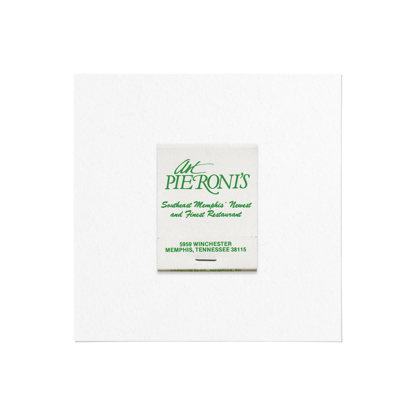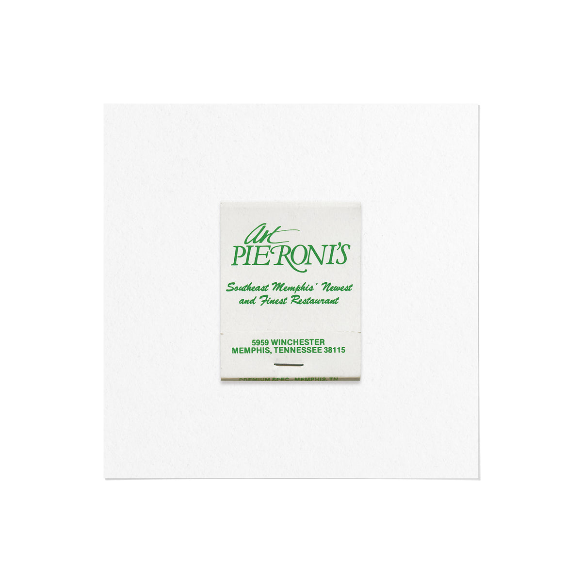 A high-quality art print of a vintage 1980s matchbook from Art Pieroni’s, a family-run Italian restaurant formerly located at 5959 Winchester Road in Memphis, Tennessee.